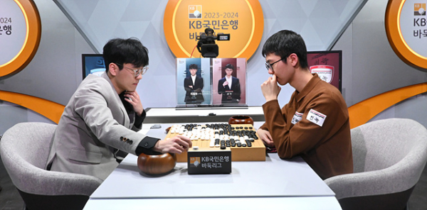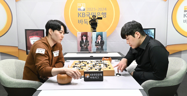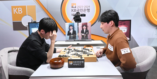 2024年3月31日,2023-2024賽季韓國圍棋聯賽第13輪展開激戰,議政府市隊主將金明訓(左)惜敗於正官莊隊副將洪性志(右)。(韓國棋院提供)