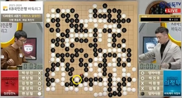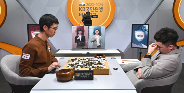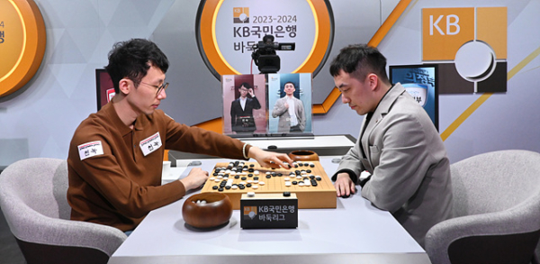 2024年3月31日,2023-2024賽季韓國圍棋聯賽第13輪決勝局,正官莊隊主將卞相壹(左)與議政府市隊外援楊楷文(右)的比賽直播畫面。(韓國棋院提供)