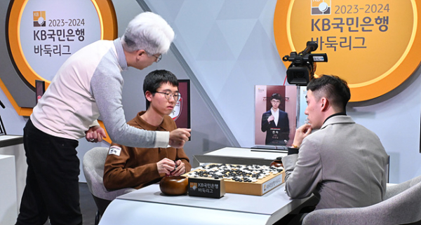 2024年3月31日,2023-2024賽季韓國圍棋聯賽第13輪決勝局,裁判長李勇讚(左)因議政府市隊外援楊楷文(右)違規而終止比賽,為雙方棋手講解規則。(韓國棋院提供)