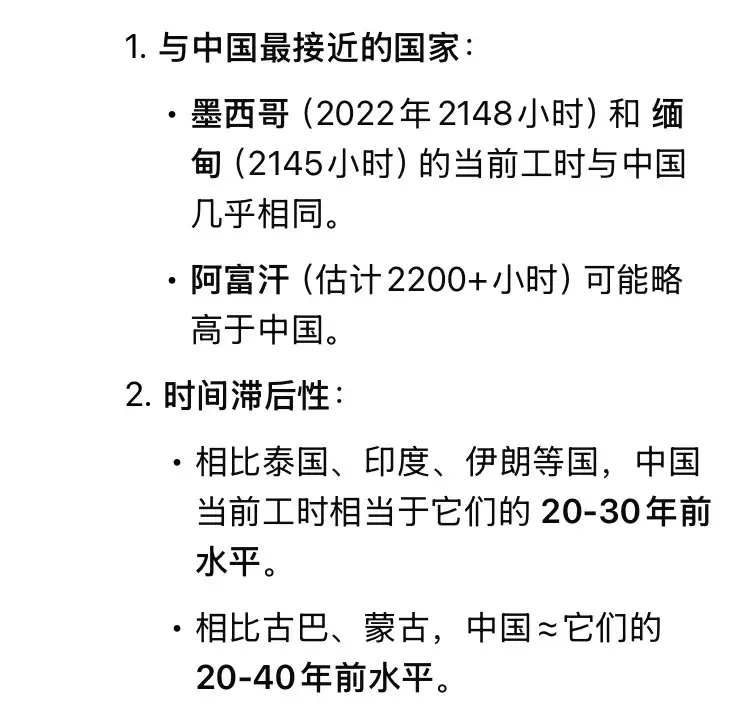 借此机会我查了下中国的劳动时间在世界上处于一个什么水平,拿了几个发达和不发达国家做对比。 的结论是: 中国的工时是高于泰国,印度,伊朗。和墨西哥、缅甸、阿富汗差不多,甚至更接近阿富汗。 当然,这些地区的工时统计可能也不是很精确。