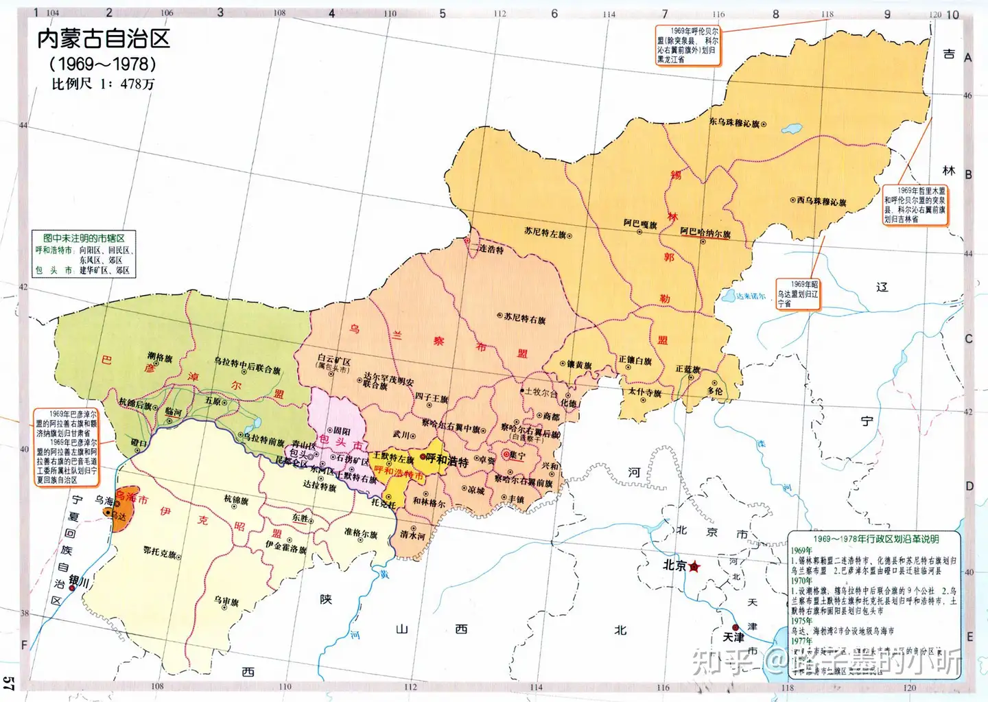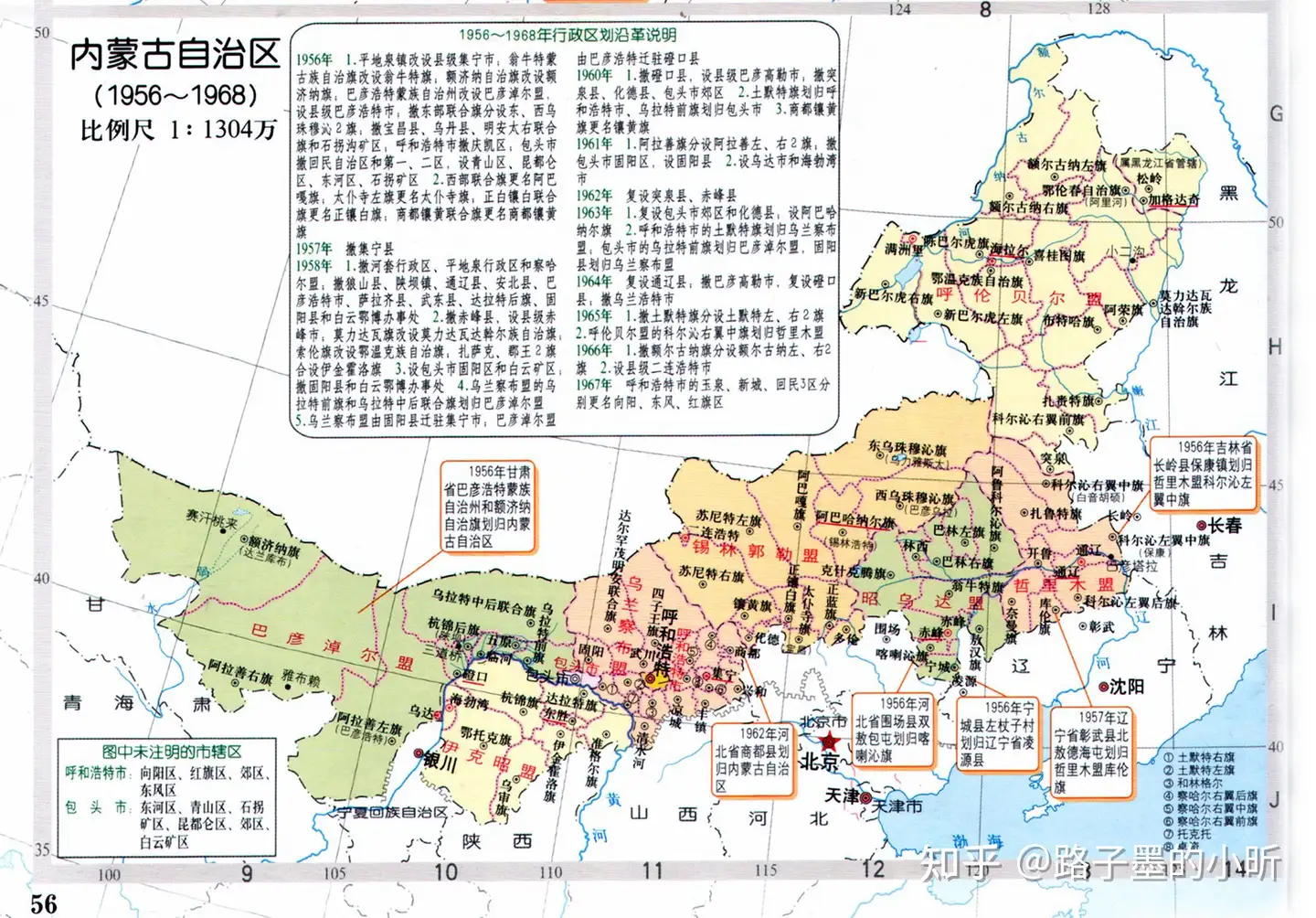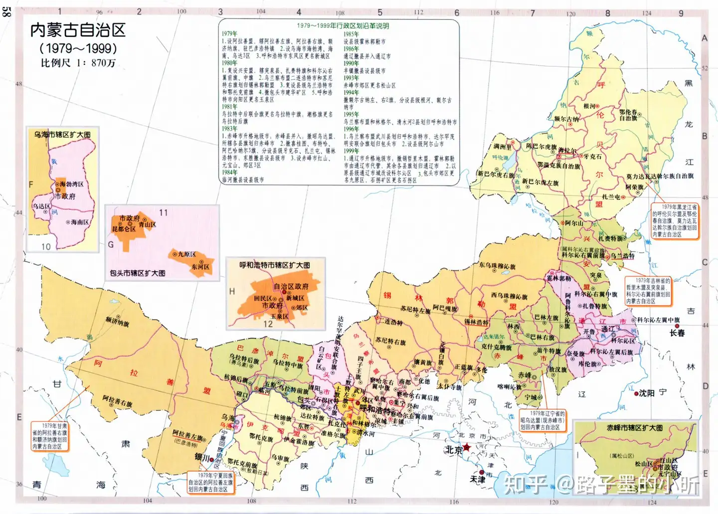 内蒙古! 呼伦贝尔 和黑龙江玩 兴安盟 和吉林玩 赤峰 通辽和辽宁河北玩 锡林郭勒 和河北玩 乌海 阿拉善和宁夏近 鄂尔多斯 和陕西亲近 包头 发展的比首府呼和浩特 好得多 就剩下首都呼和浩特和乌兰察布 在一起 内蒙古自治区东西跨度2400余公里,冠绝全国,辖3盟、9市、101个旗县市区,其中呼伦贝尔市总面积26.2万平方公里,相当于山东省和江苏省之和,是中国陆地面积最大的地级市。近代以来,内蒙古的版图经历了巨大的历史变迁。 1949年10月1日,中华人民共和国成立,12月2日,内蒙古自治政府改称内蒙古自治区人民政府,并在12月下旬将领导机关驻地迁至张家口,周恩来总理亲自主持划定了新的内蒙古“骏马”版图。 1954年3月6日 , 撤销绥远省,蒙绥合并,4月25日 , 内蒙古自治区人民政府批准归绥市改名为呼和浩特市。1955年7月30日全国人民代表大会一届二次会议决议,决定撤销热河省建制,将以牧为主、农牧并举的翁牛特旗、喀喇沁旗、敖汉旗、赤峰县、宁城县、乌丹县划归内蒙古自治区。 国务院第26次全体会议正式批准,将甘肃省巴彦浩特蒙古族自治州和额济纳蒙古族自治旗划归内蒙古自治区,恢复了阿拉善旗建制,改额济纳自治旗为额济纳旗,并将这两个旗合并为巴彦淖尔盟 。巴彦淖尔盟管辖阿拉善旗、额济纳旗、磴口县和巴彦浩特市。至此,内蒙古实现了统一的民族区域治,“骏马图”最终“绘制”完成。 1968年,在“文化大革命”特殊的历史条件下,出于意识形态考虑,中央原本决定撤销内蒙古自治区,但根据《中华人民共和国宪法》规定,设立、撤销省、省级自治区由全国人大常委会决定,变更省界由国务院决定。当时全国人大常委会已经停止办公了,撤销内蒙古自治区的决定无法做出,国务院还存在,只能由国务院做出改变内蒙古边界的决定。 1969年7月,国务院决定改变内蒙古行政区划,将呼伦贝尔盟、哲里木盟、昭乌达盟分别划归邻近的黑龙江、吉林和辽宁三省;将阿拉善左旗、阿拉善右旗、额济纳旗分别划归宁夏和甘肃,这样,内蒙古自治区虽还存在,但只剩下中间一部分了。 “文革”结束后,内蒙古人民要求把划出去的地方再收回来的呼声很高,乌兰夫也向中央提出了归还内蒙古自治区地域的要求。1979年中共中央、国务院发出(79)中发42号文件《关于恢复内蒙古自治区行政区划的决定》,从1979年7月1日起,恢复内蒙古原来的区划,被分割出去十年的内蒙古自治区骏马版图终于复原了。 “文革”结束后,内蒙古人民要求把划出去的地方再收回来的呼声很高,乌兰夫也向中央提出了归还内蒙古自治区地域的要求。1979年中共中央、国务院发出(79)中发42号文件《关于恢复内蒙古自治区行政区划的决定》,从1979年7月1日起,恢复内蒙古原来的区划,被分割出去十年的内蒙古自治区骏马版图终于复原了。