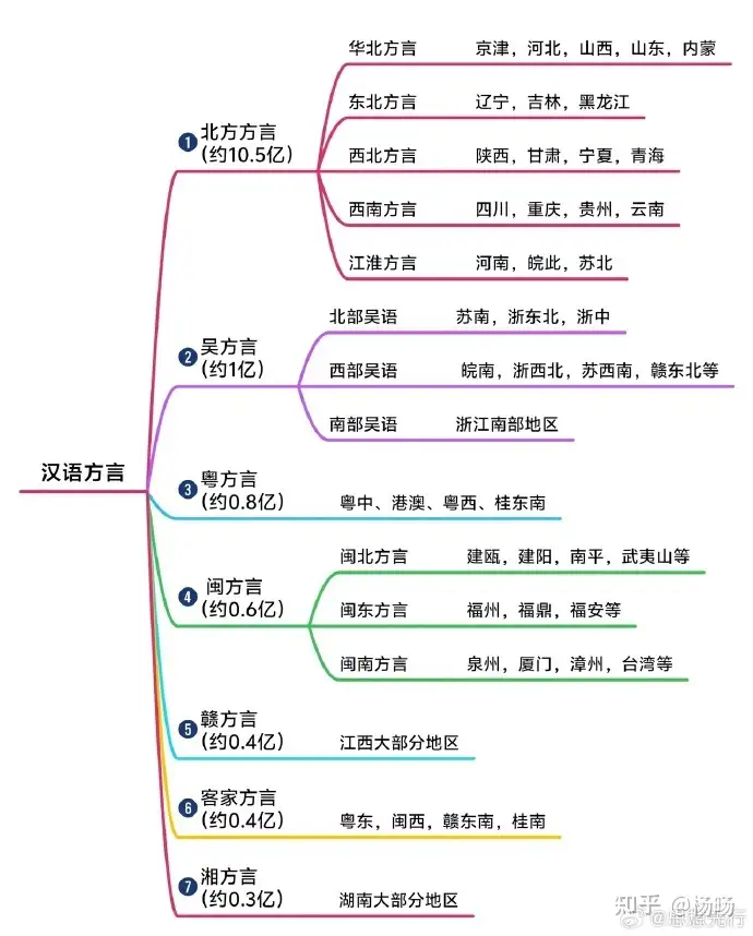 按之前的分类方法,单单莆田一个小城市所用的方言,就能跟广大北方+西南地区 接近7亿人所用的方言同一个层级。 十三大汉语方言 福建独占5个。 主要是福建内部各大方言差异真的比大家想象的还要巨大,这不是大伙儿凭感觉说“我们也是,出了村就听不懂了”,而是众多学者在浩如烟海的词汇和语音样本里研究出的结论。 当然,十三个一级方言这个说法应该是有点过时了,现在的理论(之一),可以如下图所示: