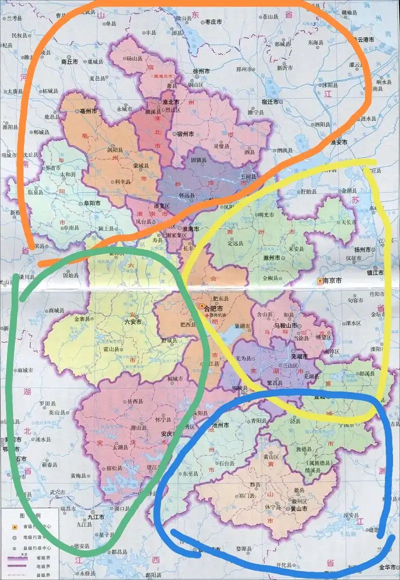 经典安徽,淮河长江横分三块,建国后为了让这团边角料起码算个省,省会才定的合肥 皖北是河南山东不要的,皖中跟湖北南京江西,皖南跟南京和浙北。或者遵循历史和地理河流走向复古南直隶