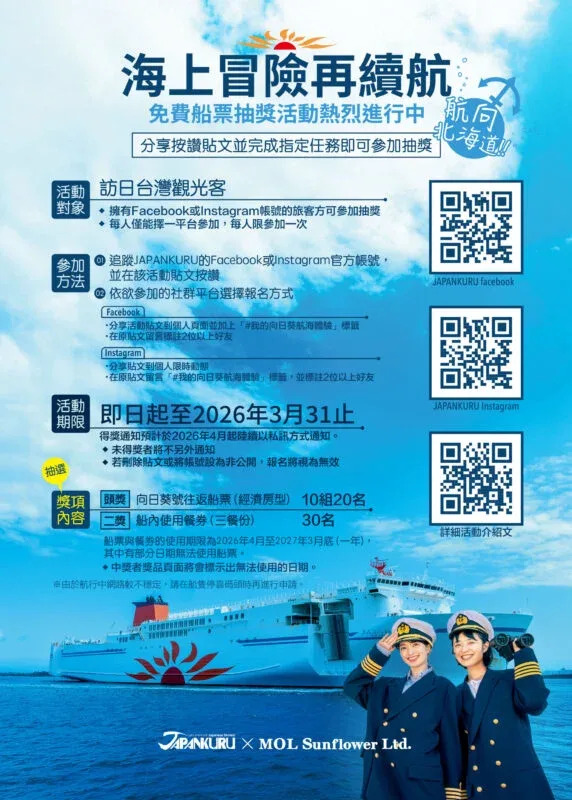► 參加方法: 1. 追蹤JAPANKURU的Facebook或Instagram官方帳號,並在該活動貼文按讚 2. 依欲參加的社群平台選擇報名方式: 【Facebook】 https://www.facebook.com/Japankuru/posts/pfbid0sBJna8hdpJAryqLoTt6rnZHNcuU6uddQAmLEUVzqNfjgShN7r1pvmQrGA7EZ46Jkl・分享活動貼文到個人頁面並加上「#我的向日葵航海體驗」標籤 ・在原貼文留言標註2位以上好友 【Instagram】 https://www.instagram.com/p/DN7hjiGkzpM/?img_index=1・分享貼文到個人限時動態 ・在原貼文留言「#我的向日葵航海體驗」標籤,並標註2位以上好友