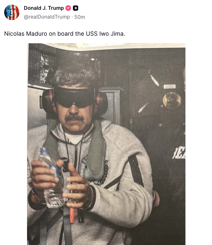2026年1月3日 週六 下午5:16川普在社群公布委內瑞拉總統馬杜洛戴眼罩、手銬,登硫磺島號照片 美國總統川普(Donald Trump)3日在自家社群平台「真實社群」(Truth Social)發布一張照片,照片中委內瑞拉總統馬杜洛身穿運動服、戴著眼罩,配文寫道:「馬杜洛在美軍「硫磺島號」(USS Iwo Jima)兩棲攻擊艦上」。