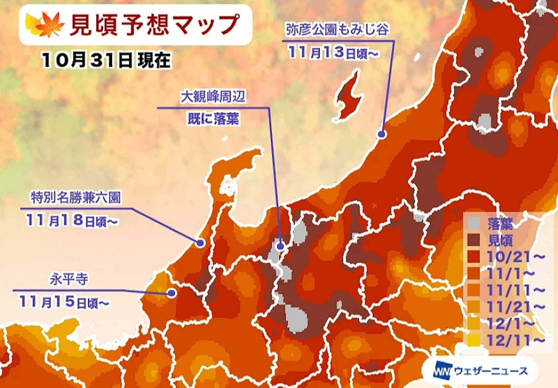 日本中部地區往年紅葉預測(圖片來源:weather.jp)