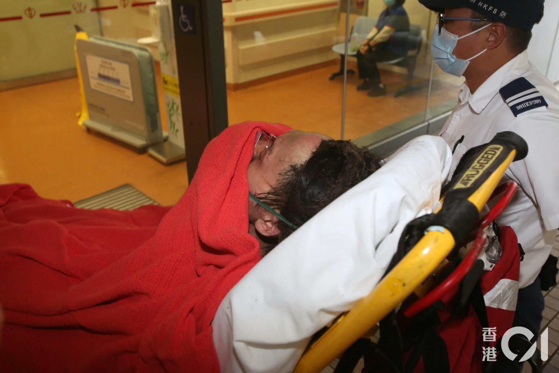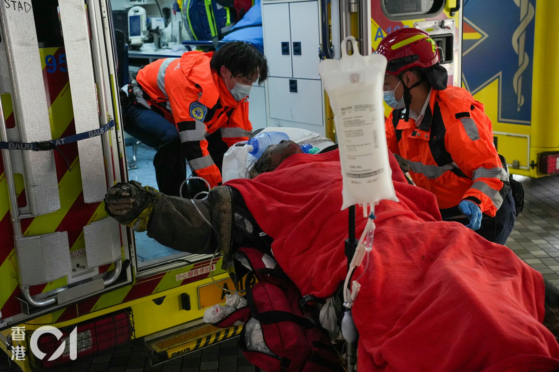 大埔宏福苑五級火,一名身穿消防抗火衣的傷者全身熏黑,昏迷被送到威爾斯親王醫院救治。(左朗星攝)