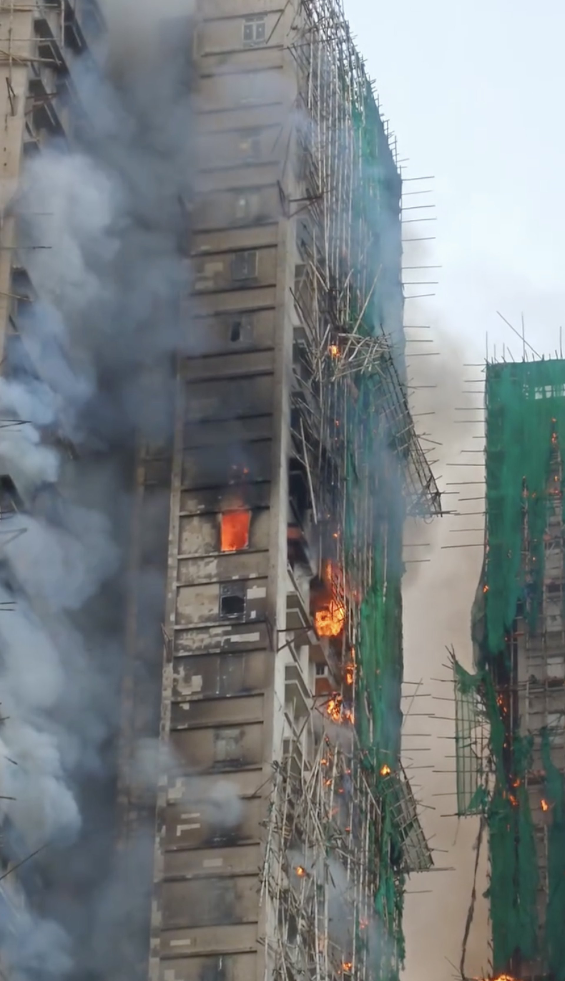 大埔宏福苑五級火,蔓延多座樓宇,火勢更由棚架燒至部分單位內部,有單內火光熊熊。(Threads@striking_biking)