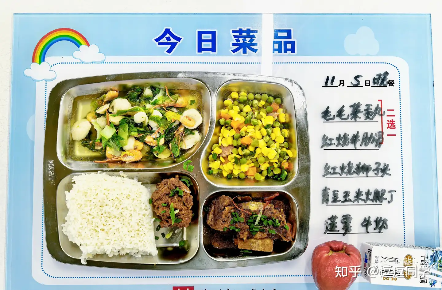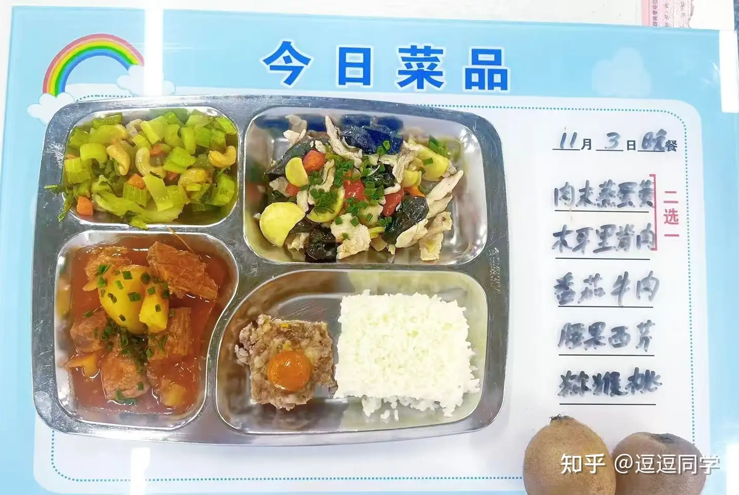 逗逗同学 13 人赞同了该回答 我女儿学校。 杭州,公办初中。 有一天甚至有一只大闸蟹 ,足足有四两,公蟹,因为有三分之一的孩子嫌弃吃起来麻烦,都给那几个爱吃的人,我女儿算是爱吃的,自己啃了一只,用纸巾包好带回两只,质量不错,很饱满。  下面是平时吃的