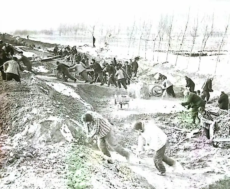 70年代时山东省东平县农民在冬季时修水利、“上河工”的场景。此图是《千軍万马搞会战,改天换地造良田(吴绪伦四十年前在东平县拍的照片)》一文中的一张图,吴绪纶是书法家、山东泰安市书法家协会名誉主席、中国国学研究会研究员,退休前还曾任泰安市委党史研究室的副编审。