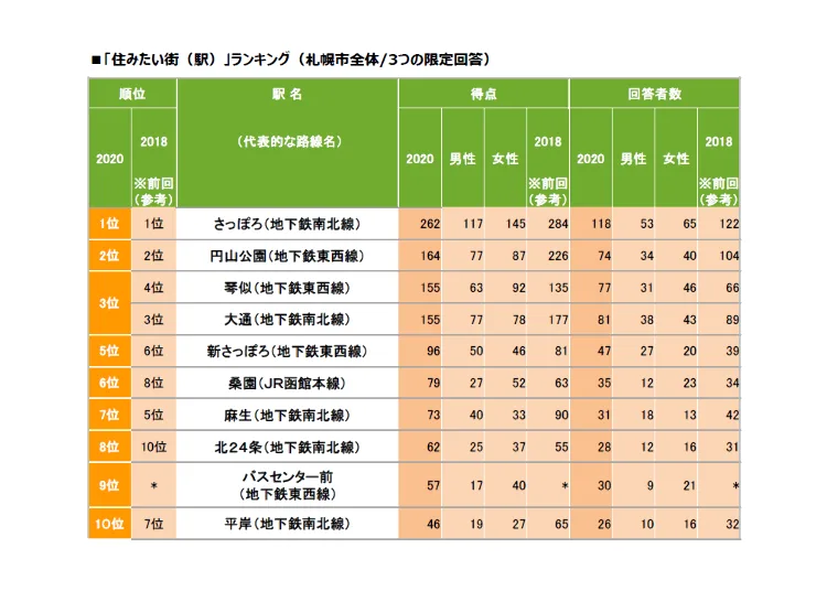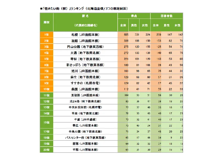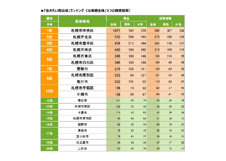 北海道人選出的第1名為「札幌市中央區」,因為交通便利及有豐富的商業設施,成為獲得高票支持的理由。另外第2名的「札幌市北區」、第3名的「札幌市豐平區」一直到第5名為止,都是位在札幌市區內的自治行政區。而札幌市外,則是第7名的「函館市」、第8名「旭川市」、第10位「小樽市」進入到前10名。