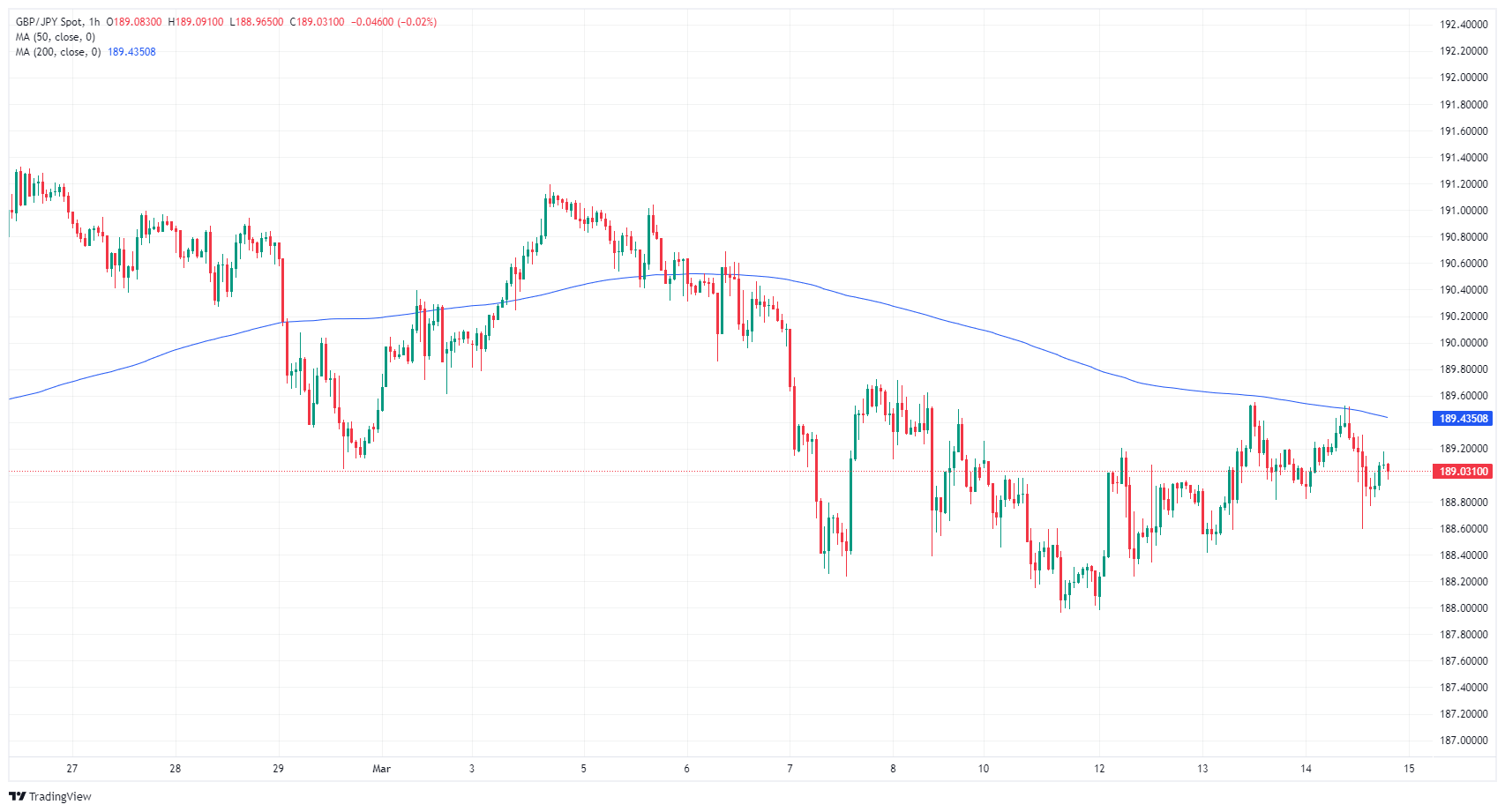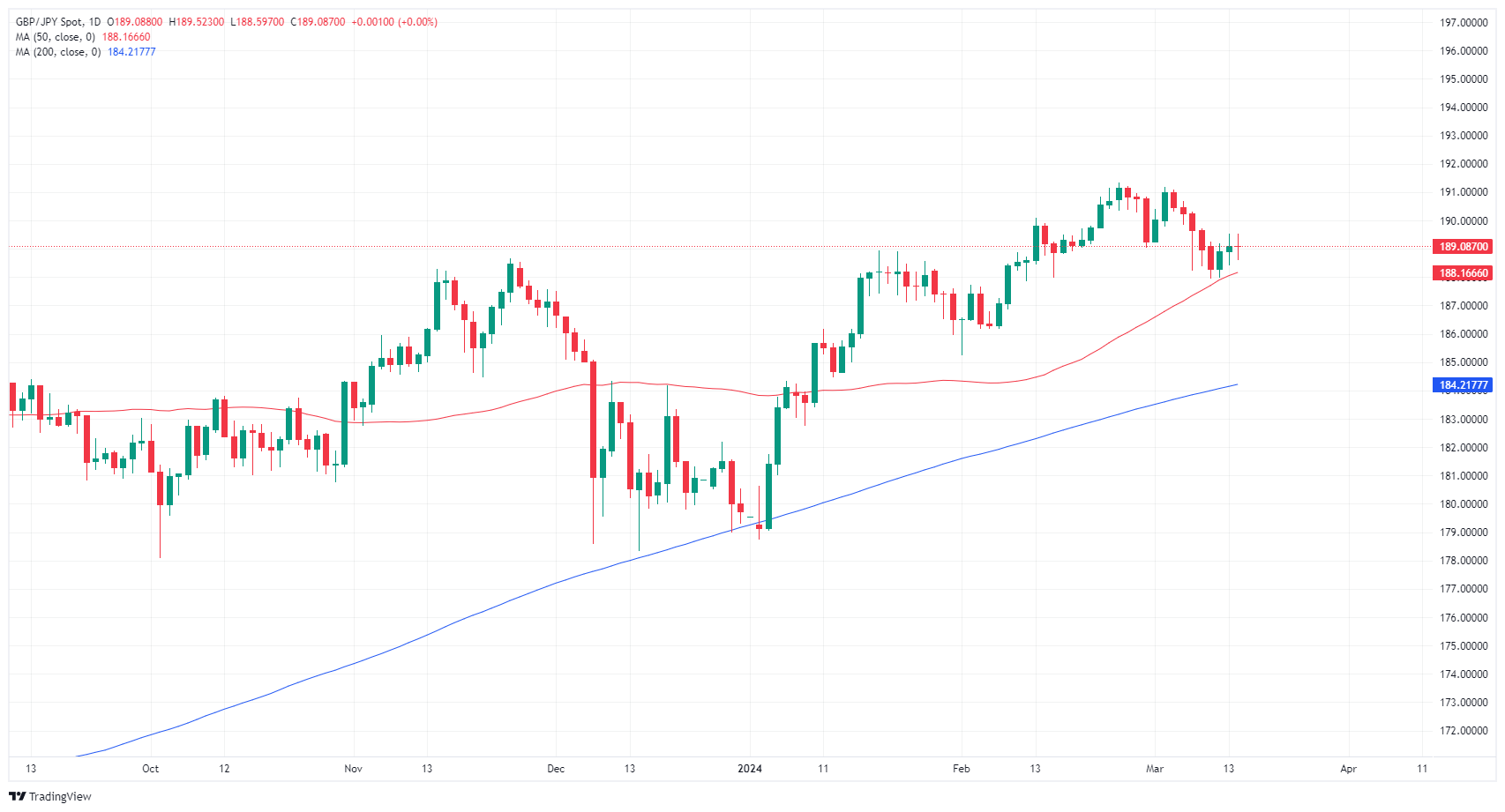 英鎊/日圓因經濟數據清淡而回落至 189.00,投資者等待利率走勢。 市場等待日本央行春季薪資談判後提供進一步細節。 週五將公佈二級數據英國消費者通膨預期。