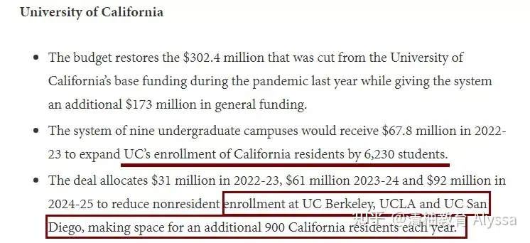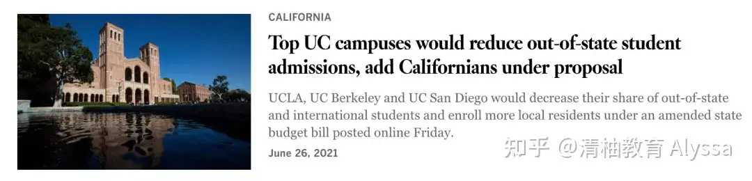 政府提案要求削减国际生数量 早在今年6月,加州政府通过的缩招预算法案就给国际生申请者们泼了一盆冷水:从2022年秋季开始的5年内(今年申请季的学生开始),UCLA、UCB、UCSD三所热门大学将把22%的州外 本科学生比例减少到18% ,腾出大约4500个名额给本地学生。