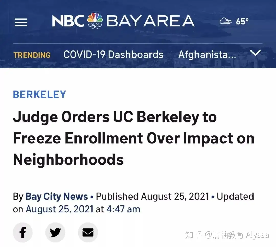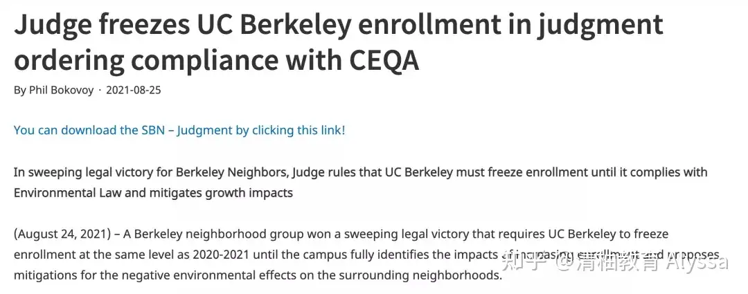 作者:清柚教育 Alyssa 链接:https://www.zhihu.com/question/434563510/answer/2229412938 来源:知乎 著作权归作者所有。商业转载请联系作者获得授权,非商业转载请注明出处。 UC Berkeley被法院勒令“冻结招生”,未来申请难度再增加! 据NBC新闻上月报道,加州大学伯克利分校被当地法院判处“冻结招生规模”,即今后最大入学人数不得超过20-21年水平。