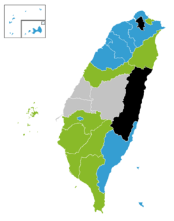 聯合報系對選舉結果的預估 藍色:中國國民黨候選人領先的縣市 綠色:民主進步黨候選人領先的縣市 黑色:無黨籍候選人領先的縣市 灰色:選情陷入膠著的縣市