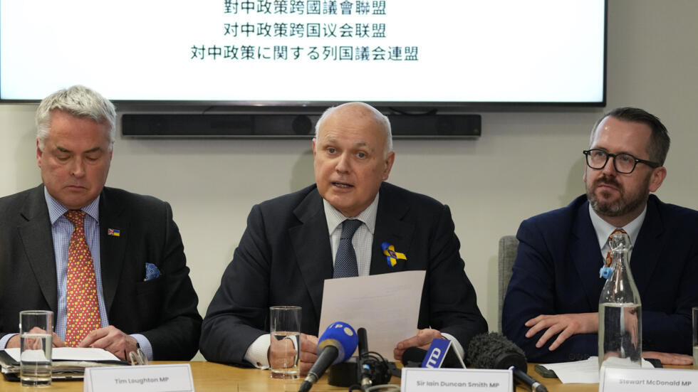 2024年3月25日星期一,倫敦,英國議會議員蒂姆-勞頓(Tim Loughton)(左起)、伊恩-鄧肯-史密斯(Iain Duncan Smith)和斯圖爾特-麥克唐納(Stewart McDonald)出席新聞發布會,揭露與中國政府有關聯的黑客對英國議員及機構進行網絡攻擊。同日,英國政府宣布制裁與中國政府有關的兩名個人及一個實體,並將召見中國駐英大使。 AP - Kirsty Wigglesworth
