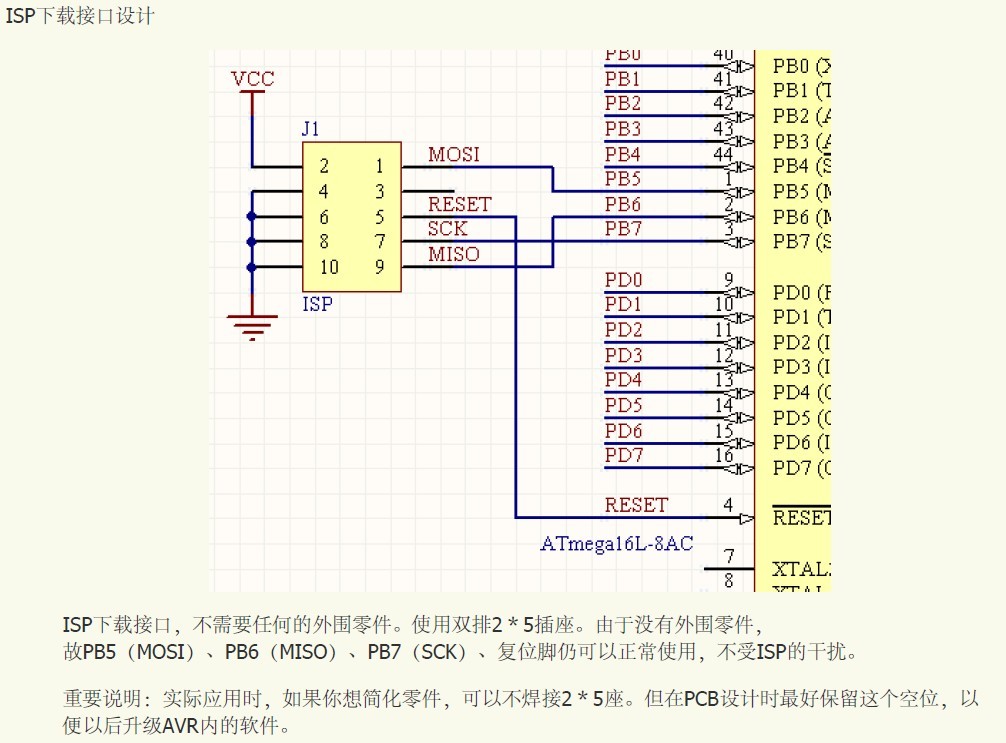 電路: 第1腳接正常的AVR RESET電路,和ATMega16一樣,電容10μF。 第3腳通過一個200歐姆的電阻接發光二極管的正極。 然後按照ATMega16的電路圖接上ISP下載口。