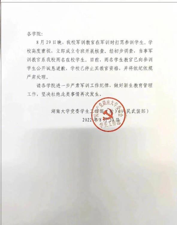 30日中午,湖南大学党委学生工作部也作出回应,经过调查核实。在昨天29日晚上,学校聘请的两名教官确实存在打骂体罚学生的行为,这两名教官系学校的两名在校生,目前学校已经依纪依规严肃处理这起事件。将这两名在校大学生军训教官开除军训教官队伍,并按照学校学生管理制度对他们进行违纪处理,他们也向参训的学生进行了公开诚恳的道歉。             |