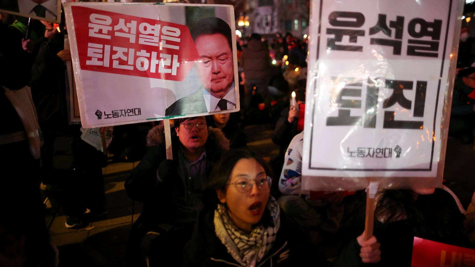 2024年12月4日,大量韓國民眾在首爾的集會上舉着標語牌,譴責總統尹錫悅3日晚突然頒布戒嚴令(數小時後撤回),並要求他辭職。(Reuters) 原文網址: 韓在野議員神預言「尹錫悅發戒嚴令」 再預測百分百會有第2次 | 香港01 https://www.hk01.com/article/1082511?utm_source=01articlecopy&utm_medium=referral