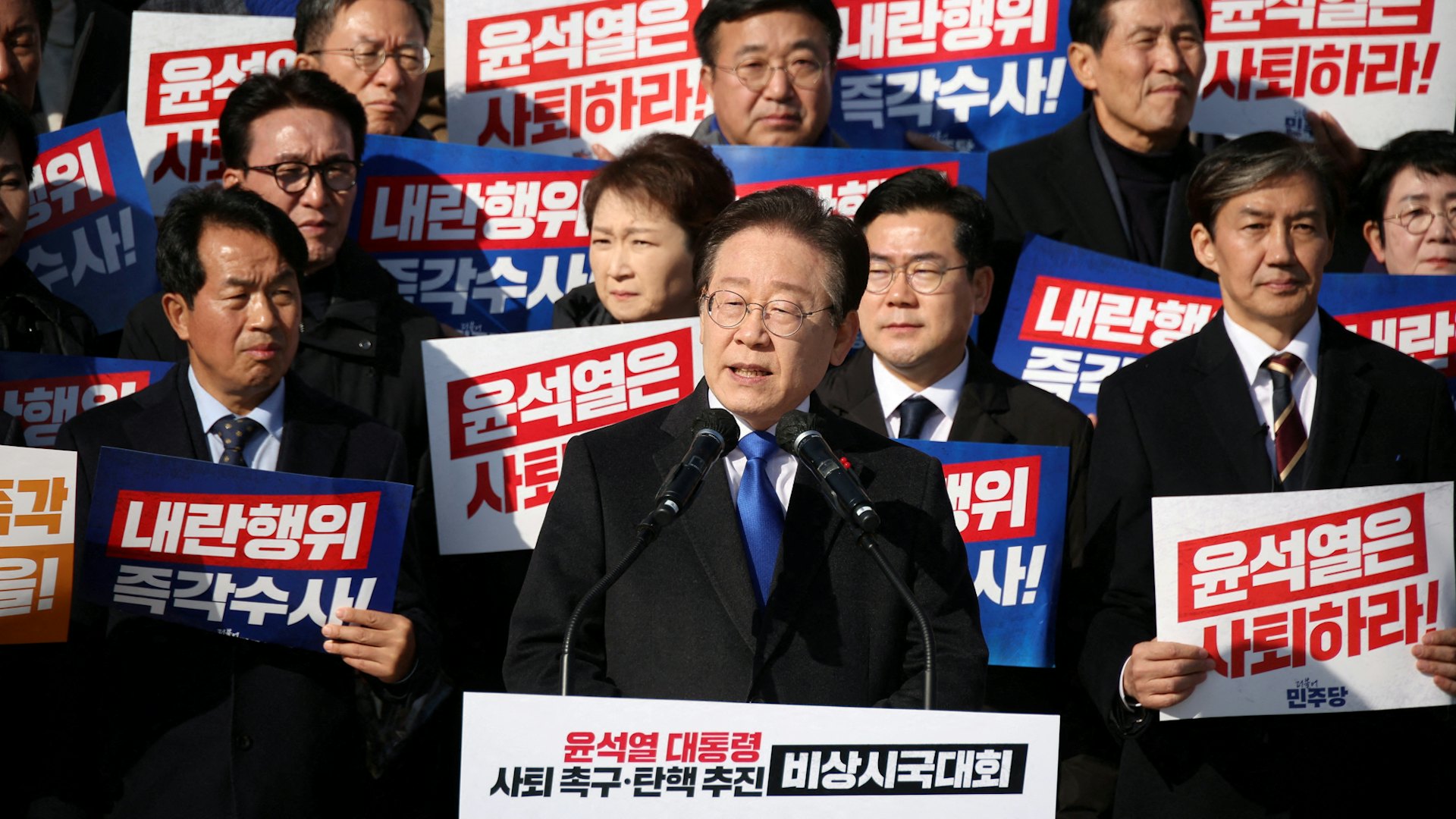 2024年12月4日,韓國在野共同民主黨領袖李在明出席在首爾舉行的集會,譴責韓國總統尹錫悅突然宣布戒嚴並要求其辭職。(Reuters)             |