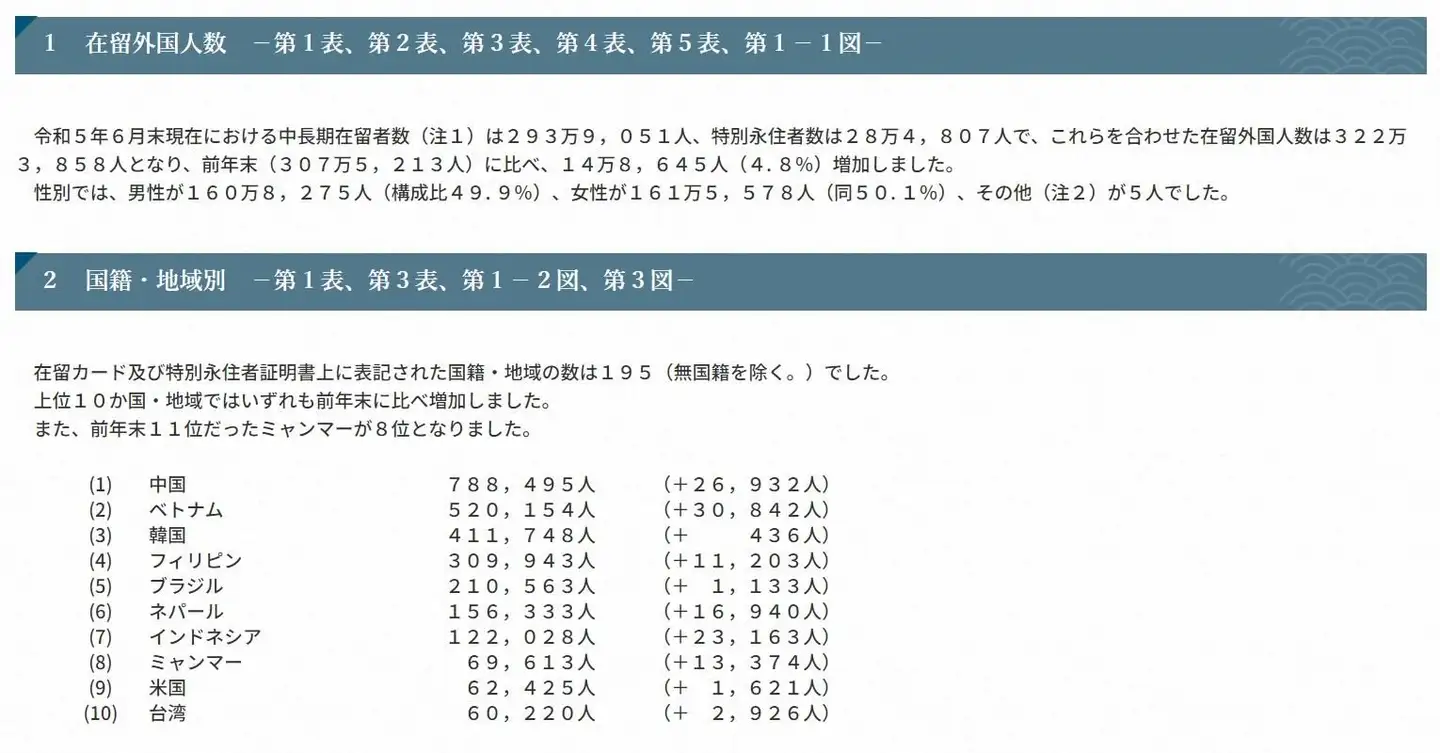 根据日本出入国在留管理厅的数据,截至2024年底,长期居住在日本的外国人总数已突破300万大关,其中来自中国大陆的在留人数高达84.4万,占比约27%。