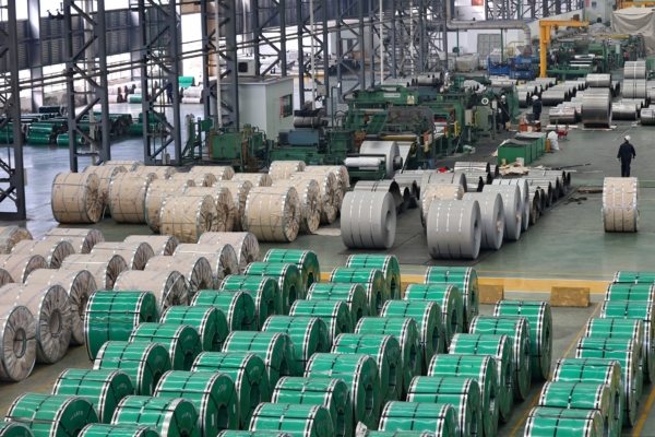 2022年3月1日,中國江蘇省南通市一家鋼鐵廠裡的鋼卷。 (STR/AFP via Getty Images)