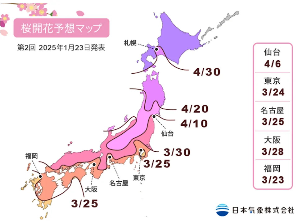 日本Weathernews櫻花預測2025 - 第一回 (2025年1月9日更新) 根據日本氣象新聞公司Weathernews最新發佈的2025年首份櫻花開花日預想顯示,作為開花指標的染井吉野櫻將於3月21日東京開始,22日開到橫濱及高知,3月底開至西日本至東日本如3月24日名古屋、3月26日大阪,4月初到東北,4月底登陸北海道,直至5月初開滿整個北海道!留意以上開花日起計5日至2星期將進入滿開狀態,滿開後數天便進入夢幻的「櫻吹雪」,畫面各有特色!