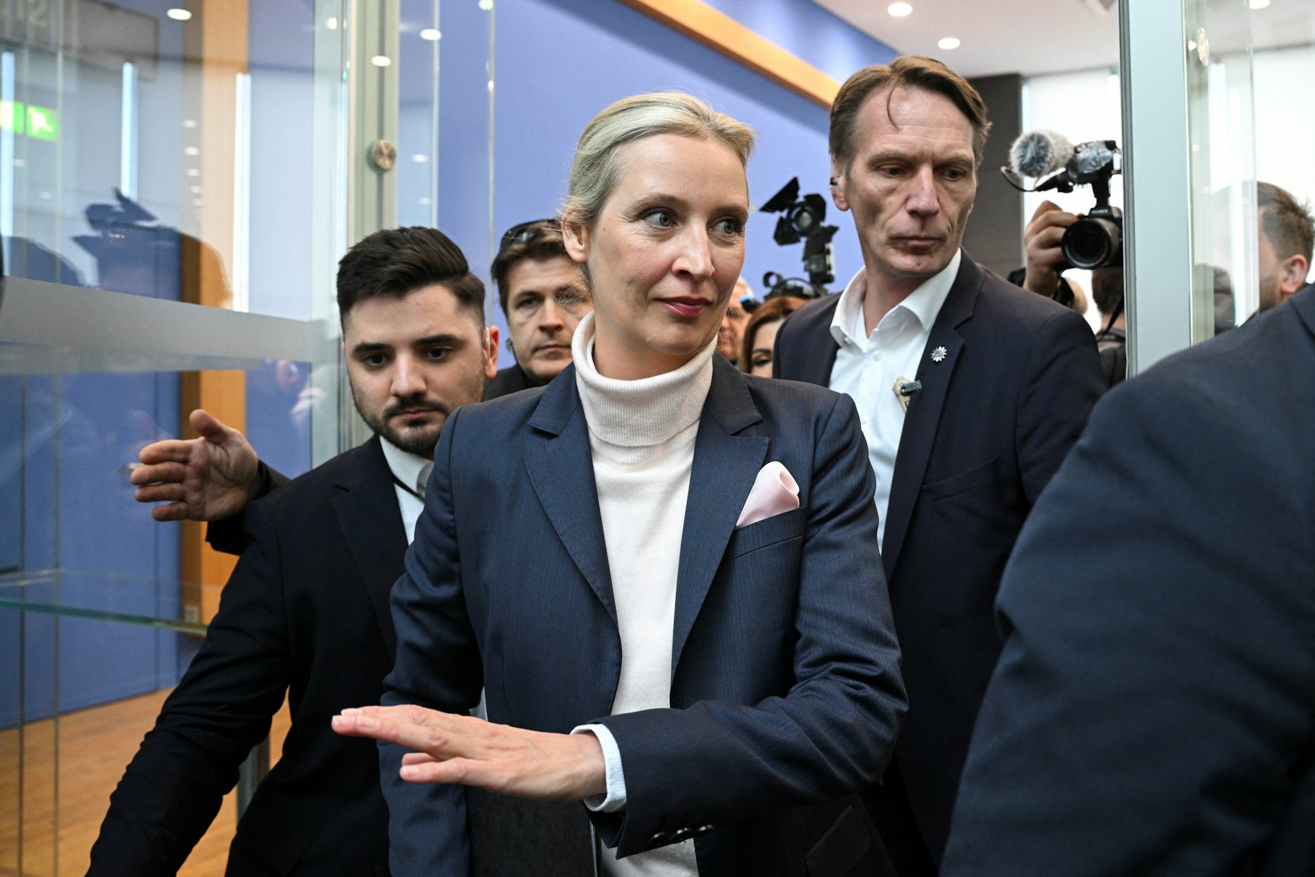 圖為2025年2月24日,德國另類選擇黨(Alternative für Deutschland,AFD)聯合黨魁魏德爾(Alice Weidel)在大選結束後離開新聞發布會現場。(Reuters) 原文網址: 德國大選 | 極右AfD將東德染藍 社交媒體政治選舉影響愈發強大 | 香港01 https://www.hk01.com/article/60213986?utm_source=01articlecopy&utm_medium=referral