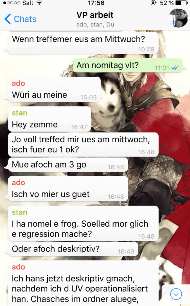 我随便图了一下whatsapp一个对话,会德语的小伙伴可以试试能否能看懂苏黎世和图尔高腔 (。
