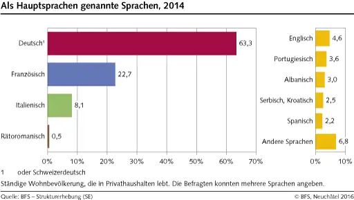 这是瑞士四门官方语言的数据。 分别是德法意和罗曼什语,其中德语包括了瑞士德语。黄色的则是非官方语言,顺序分别为:英语、葡萄牙语、阿尔巴尼亚语、塞尔维亚语&克罗地亚语、西班牙语和其他。(数据来源:联邦政府统计局/Bundesamt für Statistik)备注:可多选。