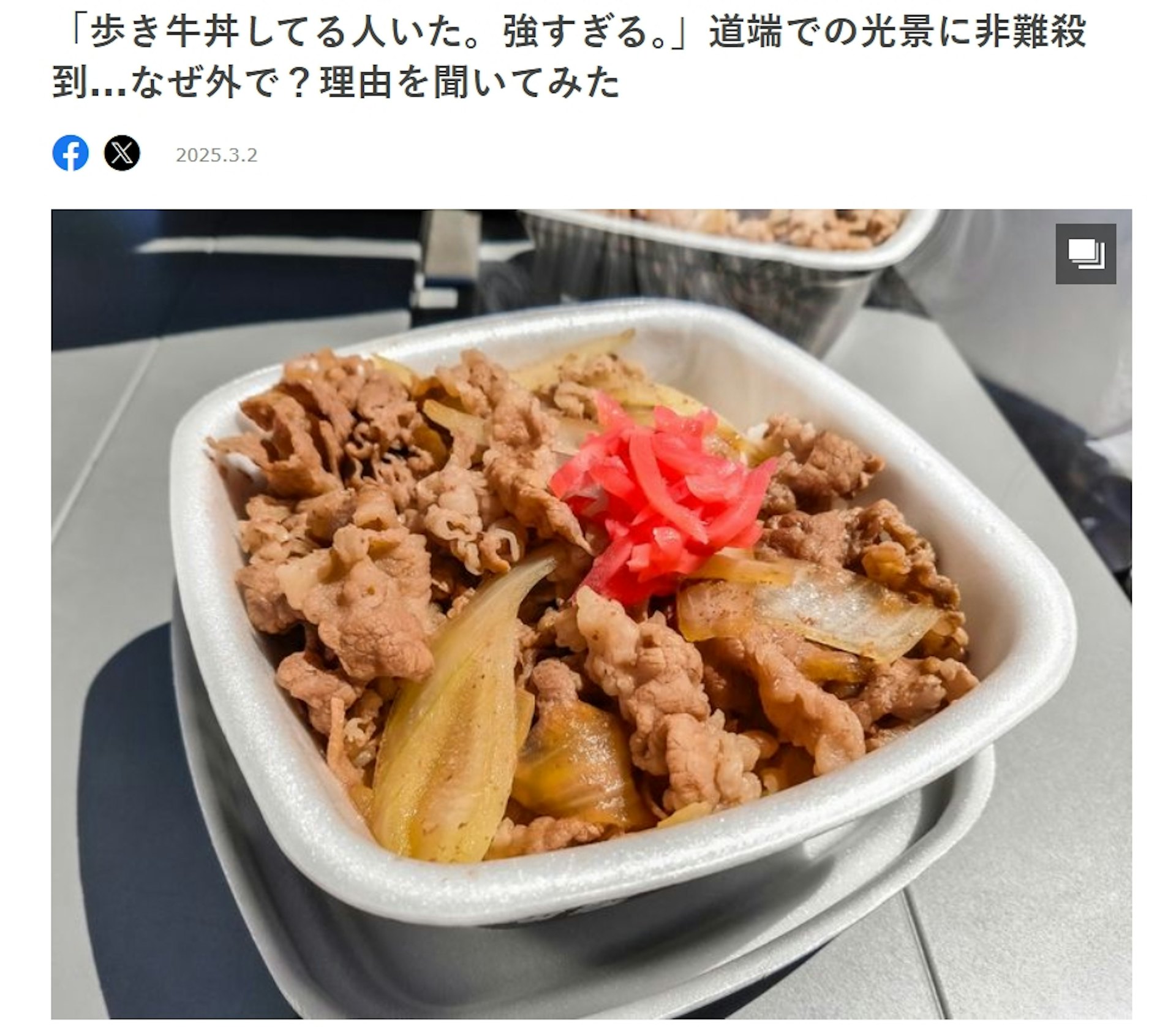 根據日媒「Trilltrill」報道,社群媒體近日出現引發熱議的貼文,有人因目擊到路人邊走邊吃牛丼而大感震驚,認為這與傳統用餐習慣大相逕庭。