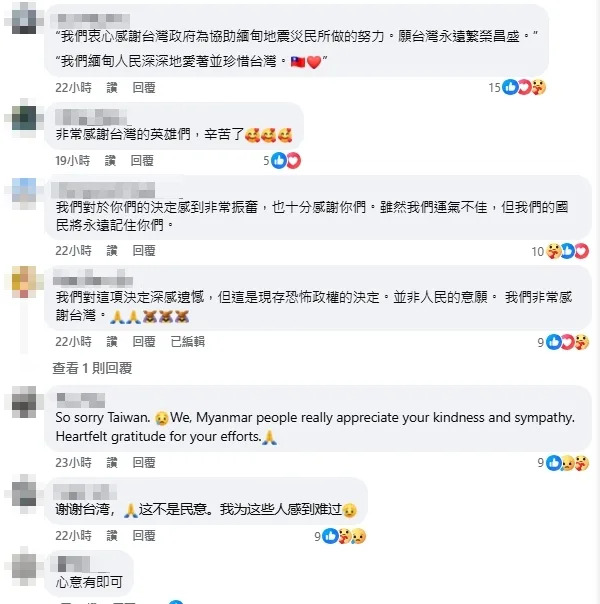 眼看台灣想幫忙救人,卻因為緬甸內政問題無法前進,相關新聞也逐漸在各大社群上發酵,許多緬甸網友對於救難隊的一片好心,感到相當愧疚,紛紛在留言區寫下「我們對這個決定深感抱歉,但這是政府的決定,並不是人民的意願,但還是非常感謝台灣隊」、「我們衷心感謝你們為拯救我們的人民所做的努力,我們不會忘記你們的友好努力。來自緬甸的愛」、「我們對於你們的決定感到非常振奮,也十分感謝你們。雖然我們運氣不佳,但我們的國民將永遠記住你們」。