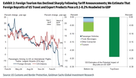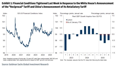 1h ago09.32 BST Goldman Sachs: 45% risk of US recession in next year Goldman Sachs has slashed its forecast for US economic growth this year, and warned there is a growing risk that America falls into recession in the next year. Goldman has lowered its 2025 growth forecast from 1.0% to 0.5%, due to fears that Donald Trump will raise tariffs by much more than it had expected. In a note titled “US Daily: Countdown to Recession”, Goldman also lifted its 12-month recession probability from 35% to 45%, following “a sharp tightening in financial conditions, foreign consumer boycotts, and a continued spike in policy uncertainty” following Trump’s tariff announcements. Goldman analysts explain that they had expected the White House to announce a more aggressive tariff at first and then scale it back; instead, the new tariffs scheduled for 9 April would lift the effective tariff rate by more than expected. They say: First, financial conditions tightened more aggressively than we had expected in response to the White House’s announcement of its “reciprocal” tariff and the Chinese government’s announcement of its retaliatory tariffs on US exports. This is partly because both announcements were more aggressive than expected. But it also suggests that the sensitivity of financial conditions to incremental tariffs is rebounding from the moderate levels of early 2025 toward the more outsized levels observed in the 2018-2019 trade war.