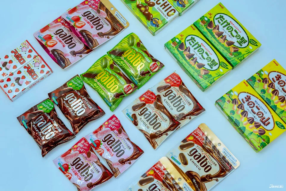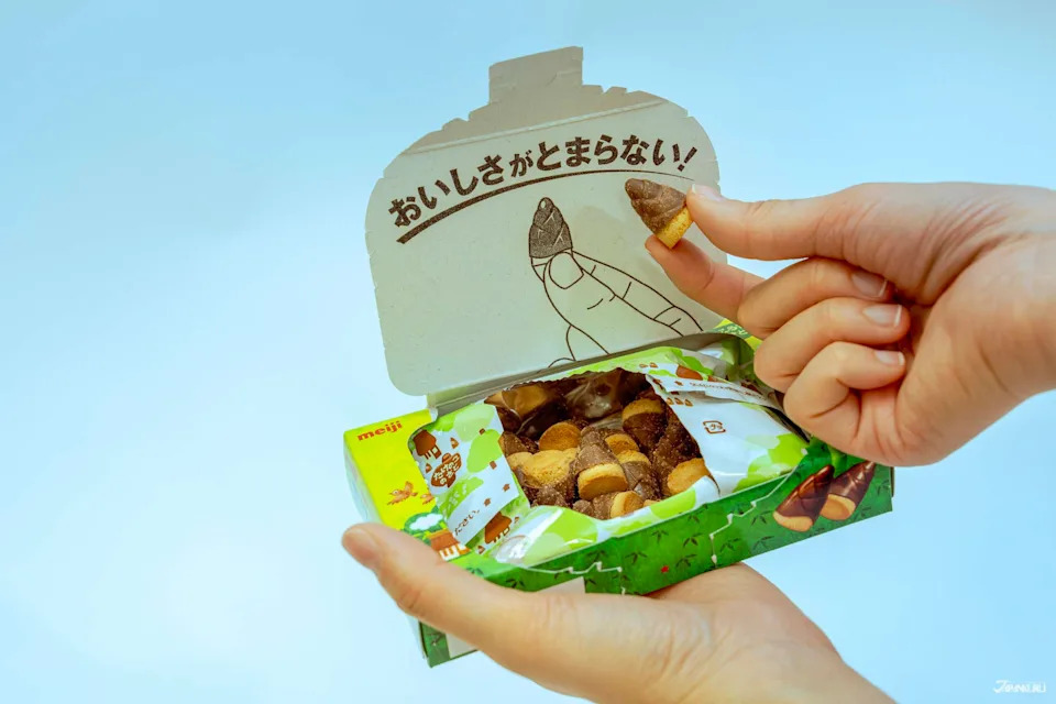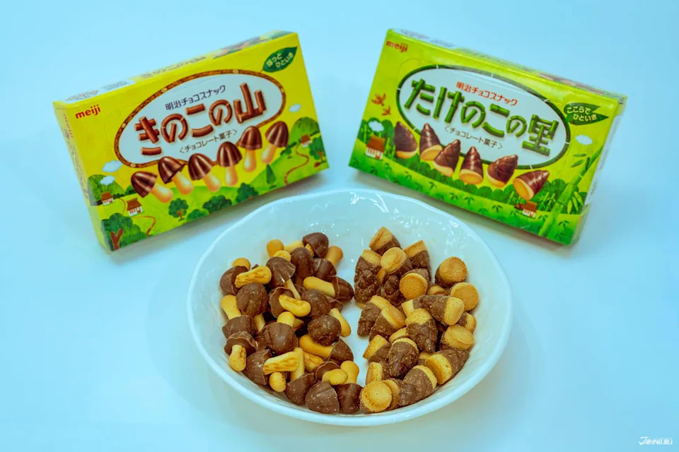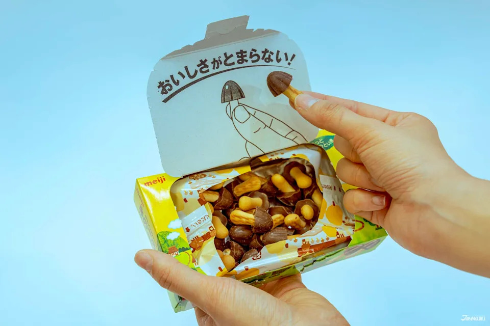 接下來,要介紹的是傘狀蘑菇造型的「蘑菇山(きのこの山)」,以及上尖下圓的竹筍造型「竹筍里(たけのこの里)」,明治巧克力界的兩大話題性巧克力點心。