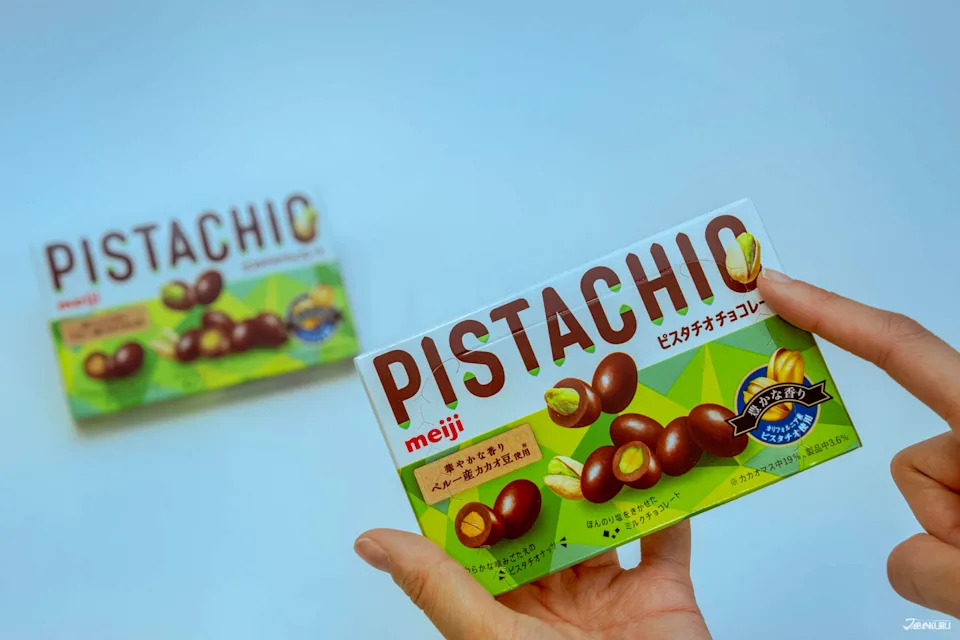 日本堅果巧克力的代表品牌明治,繼經典的「杏仁」與「夏威夷豆」之後,再度推出備受喜愛的「開心果」口味巧克力——「明治開心果可可球(ピスタチオチョコレート)」。