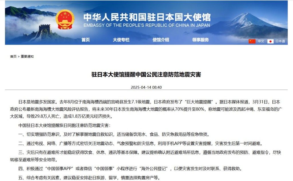 中國大使館於周一(14日)發文指出,日本是地震多發國家。去年8月位於南海海槽西端的宮崎縣發生7.1級地震,日本政府發布「巨大地震提醒」。日本媒體報道,3月31日,日本政府公布最新南海海槽大地震風險評估報告,將未來30年日本發生南海海槽大地震的概率從70%提升至80%,稱地震可能波及西起沖繩、東至福島的廣大區域,導致29.8萬人死亡,造成1.8萬億美元經濟損失。