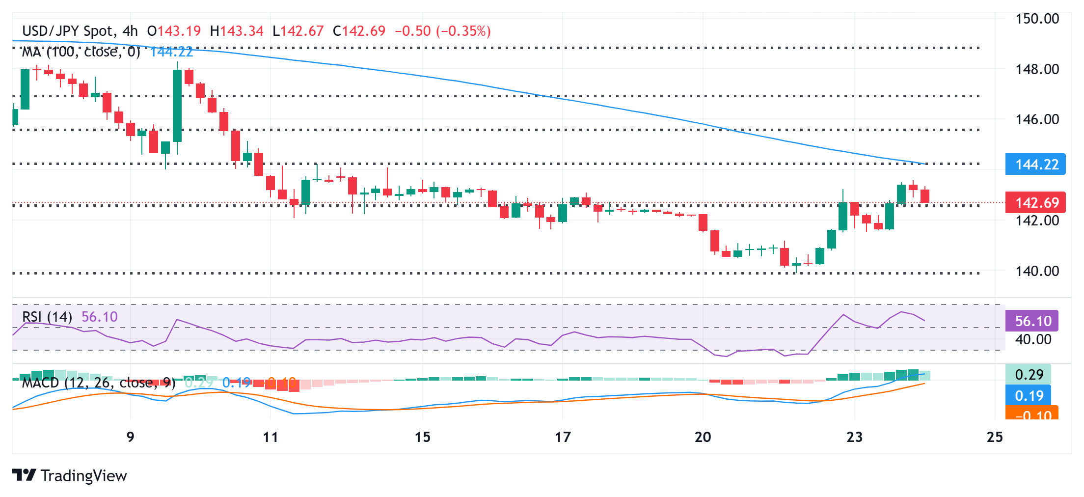 從技術角度來看,隔夜收盤於3月-4月跌勢的23.6%斐波那契回撤位和143.00關口被視為美元/日圓多頭的關鍵觸發因素。此外,小時圖上的振盪指標正在獲得積極的動能,支持在142.45-142.40區域出現逢低買入者的前景。這應該有助於在142.00整數關口附近限制下行空間,若跌破該水平,現貨價格可能滑落至141.00中間區域。下行軌跡可能進一步延伸至140.50中間支撐位,並最終暴露出多個月低點,即週二觸及的140.00心理關口以下的水平。 另一方面,若重新回到143.00關口上方,可能在143.55區域或隔夜高點附近面臨一些阻力。若有後續買盤,可能會將美元/日圓匯率推升至144.00整數關口,然後是144.35的交匯水平。後者包括38.2%斐波那契水平和4小時圖上的200期簡單移動平均線(SMA),若果斷突破,應該為近期的有意義反彈鋪平道路。