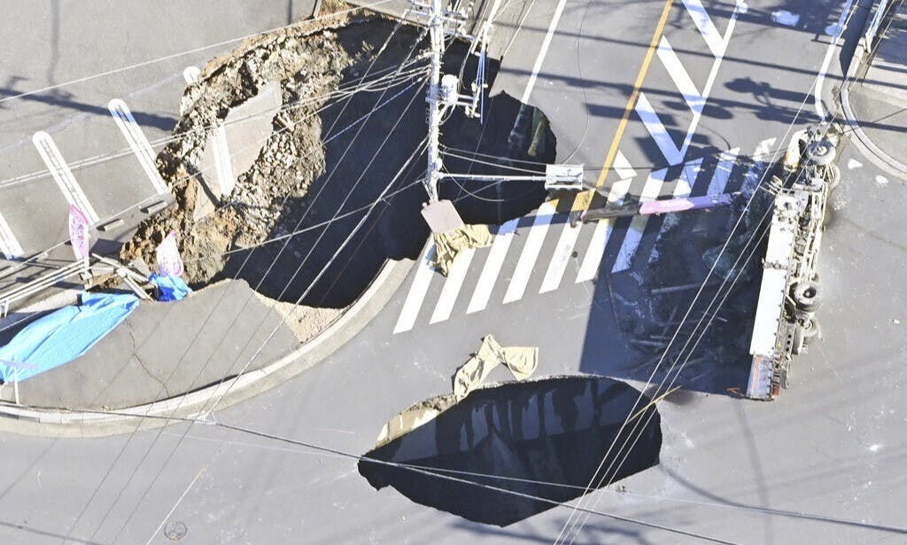 埼玉出現巨大天坑,令一輛卡車掉落,男司機遇難。美聯社