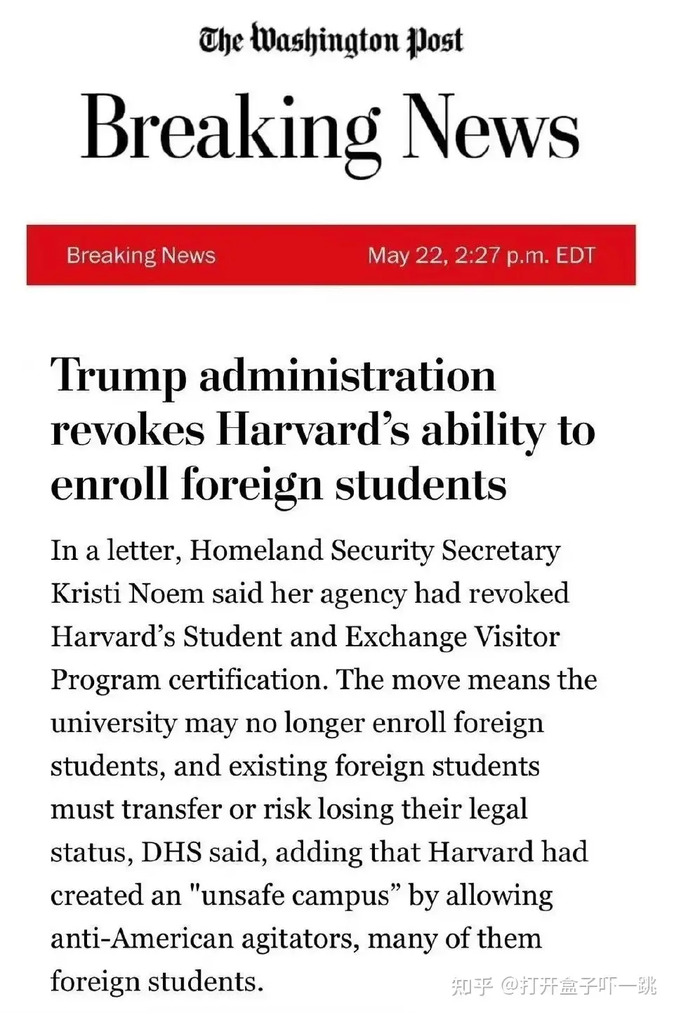 早上就看到了,刚想写点啥,突然想想会不会有反转。 刚刚一看新闻推送,还真反转了。 但是这事儿不会完。这次川普政府突然发难的理由是哈佛“通共”“通中”“通哈(马斯)”“反犹”,还是意料之中的那几样。 应该还是极限施压那一套,逼哈佛让步,清算DEI。双方攻防战才刚刚开始。 川普今年几个大事都没做成,债务到期在即,他肯定要在一些地方“赢”才行,后面奇葩事多得很。