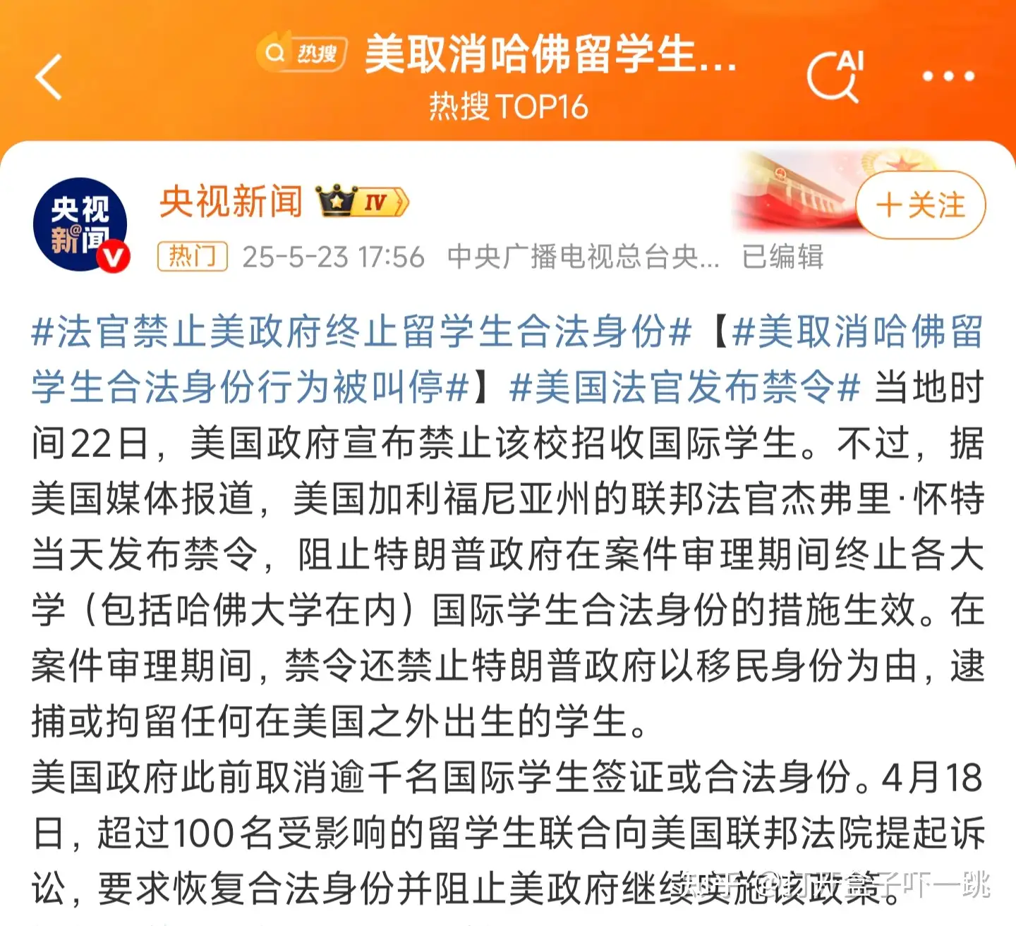 哈佛大学称已就美政府对国际学生的禁令提起诉讼 央视新闻消息,当地时间5月23日,哈佛大学表示,已就美国政府对该校的国际学生禁令提起诉讼。 特朗普政府宣布禁止哈佛大学招收国际学生,美法官叫停!中国学生占哈佛大学国际学生的20%,中方表态 每经编辑|张锦河 据央视新闻,当地时间22日,美国政府宣布取消哈佛大学获得的学生和交流学者项目资质,禁止该校招收国际学生。 不过,据美国媒体报道,美国加利福尼亚州的联邦法官杰弗里·怀特当天发布禁令,阻止特朗普政府在案件审理期间终止各大学(包括哈佛大学在内)国际学生合法身份的措施生效。在案件审理期间,禁令还禁止特朗普政府以移民身份为由,逮捕或拘留任何在美国之外出生的学生。 怀特表示,政府对原告以及其他国际学生的生活“造成了严重破坏”。 对此,美国土安全部方面发表声明称,该裁决导致正确举措的实施被延迟,希望更高级别的法院能支持美国政府的立场。美司法部拒绝就联邦法官的禁令发表评论。 美官员警告所有大学:应好自为之,尽快整顿  美国政府当地时间5月22日宣布取消哈佛大学获得的学生和交流学者项目资质,禁止该校招收国际学生。哈佛大学现有外国学生也必须转学。学生和交流学者项目由美国国土安全部下属机构管理。 美国国土安全部部长诺姆当天致信哈佛大学,称可以给哈佛大学“机会”重新获得资质,但校方要在72小时内提交过去五年内外国留学生的记录,包括任何抗议活动的音视频资料。诺姆当天在接受美国福克斯新闻台采访时还称,这是对美国其他大学的警告,所有大学都应好自为之,尽快整顿。 外交部回应美政府拿哈佛开刀:将坚定维护海外中国学生、学者的正当合法权益 5月23日,外交部发言人毛宁主持例行记者会。有记者问:美国政府22日宣布取消哈佛大学获得的学生和交流学者项目资质,禁止该校招收国际学生。根据这一决定,哈佛大学除了不能再招收国际学生入学外,现有的外国学生必须转学,否则将失去合法身份。中国学生占哈佛大学国际学生的20%,中国外交部如何看待这一点?  毛宁表示,中美教育合作是互利的,中方一贯反对将教育合作政治化,美方有关做法只会损害美国的形象和国际信誉。中方将坚定维护海外中国学生和学者的正当合法权益。 每日经济新闻综合自央视新闻 香港科技大学宣布,向哈佛学子敞开教研大门,应对全球学术变局,美官员警告所有美国大学尽快整顿,如何解读? - 知乎11 关注 · 7 回答问题