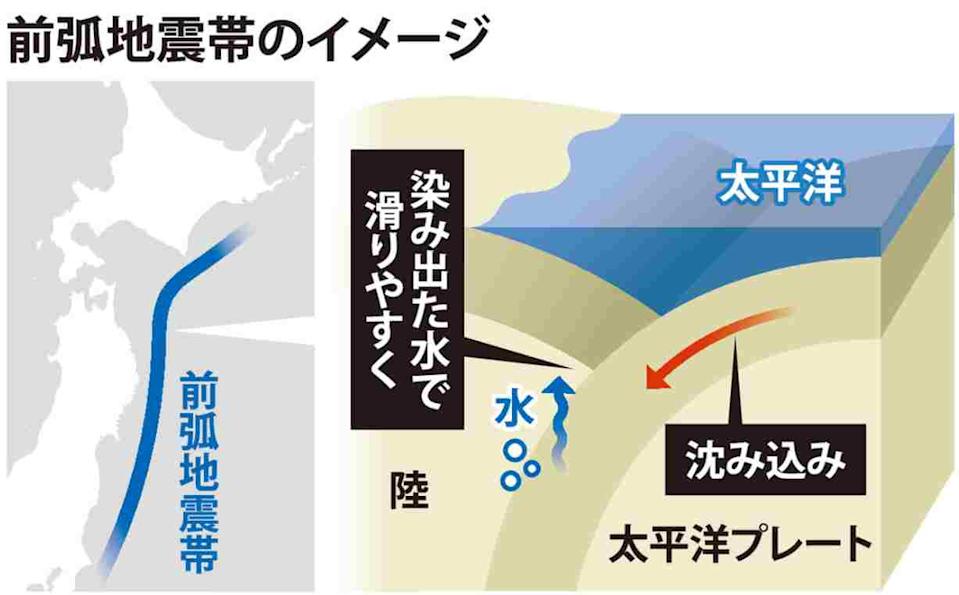 由太平洋板塊深層地下高溫高壓環境下,水從岩石中滲出並上升至地表,形成垂直延伸、如同「地震幕簾」般的「地震集中帶」。(圖片來源:每日新聞)