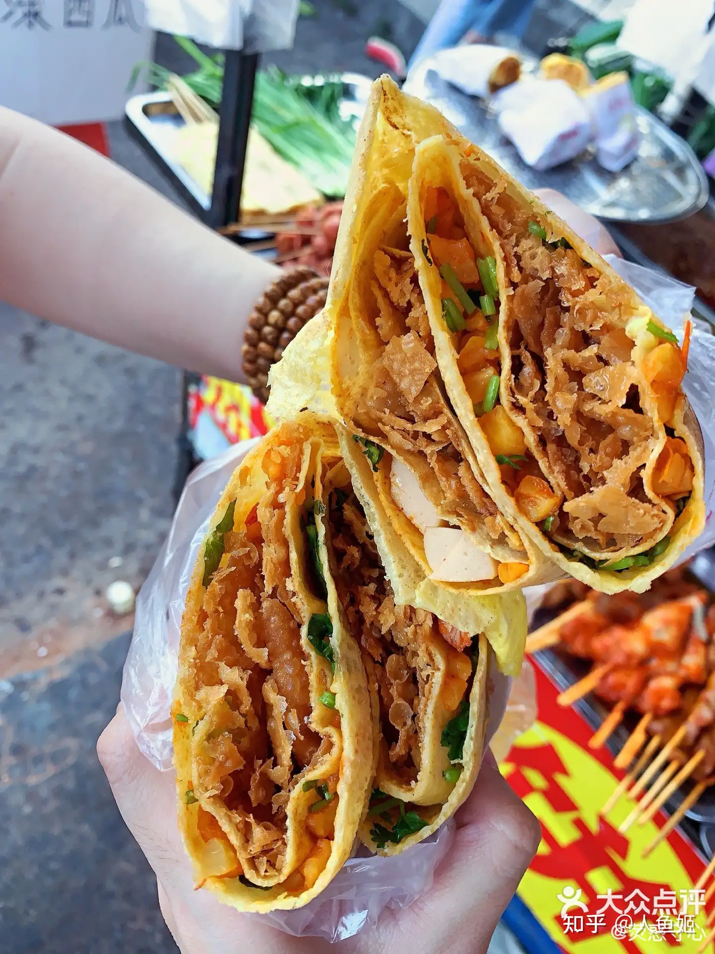 哏儿都人民可能不知道,我们外地人平时吃到的煎饼果子是这样的∶  这样的∶  薄薄的饼皮刷上酱,裹着香酥的薄脆和咸菜,撒上葱花香菜,还能按照个人喜好加料,趁热吃起来香脆可口,那叫一个热乎喷香,回味无穷啊~~ 其实上图的应该叫山东杂粮煎饼 ,但是没办法,天津煎饼果子名气太大,所以外面卖煎饼的都打着煎饼果子的名号。 正宗的天津煎饼果子长这样(上方加了果篦 ,下方的加了双果子)∶  怎么说呢。 我带南方小伙伴去吃,他们的评价跟我第一次吃的时候差不多∶ 1. 油条居然是软的,不是脆的?它夹在饼里的作用是什么呢?饼里夹点增加口感或者风味的东西,油条单独拎出来吃不好吗? 2. 平时吃的基本上是小麦面粉做的饼。这种绿豆面的口感味道都有点吃不惯。 3. 更神奇的是,酱里还能加腐乳 。风味…更独特了。 4.份量太顶了,吃完一套真的一上午都不会饿。 总结下来就是,可能是先入为主的缘故,还是我们平时吃的不正宗的煎饼果子更好吃一些… 但是更魔性的是,天津煎饼果子你说一开始吃不太习惯吧,但是它又越吃越香越吃越上头。最后小伙伴还是打包了一套带走上高铁了。