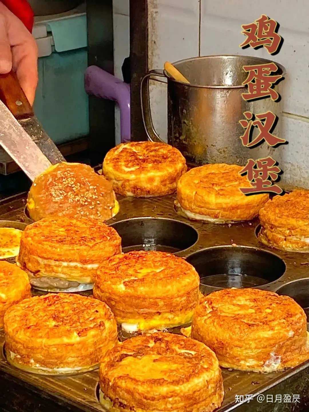 有着圆圆格子的小炉子里,刷上食用油,倒上一层面糊煎至定型。打入一个鸡蛋,撒上葱花,铺上一层猪肉馅或火腿肠继续煎,把另一个格子里煎好的面糊盖在鸡蛋和肉馅上,刷上特制的辣酱就可以吃了。  外皮脆脆的,里面的鸡蛋和肉馅松软热乎喷喷香,冬天买上一个握在手里,一边吃一边哈气,极致幸福。