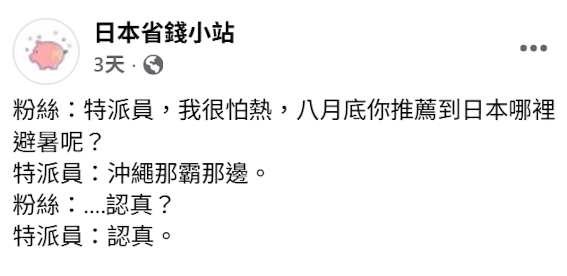 日本省錢小站貼出粉絲發問,「特派員,我很怕熱,8月底你推薦到日本哪裡避暑呢?」,特派員回答「沖繩那霸那邊」,粉絲難以置信這個答案,特派員還強調「是認真的」,並附上日本各地的氣溫。
