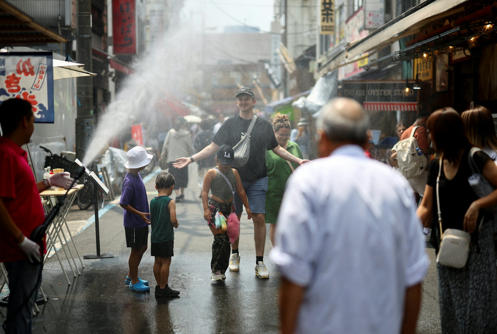 2025年8月22日在日本東京築地場外市場街頭,外國遊客在高溫下噴灑水霧降溫(Reuters)