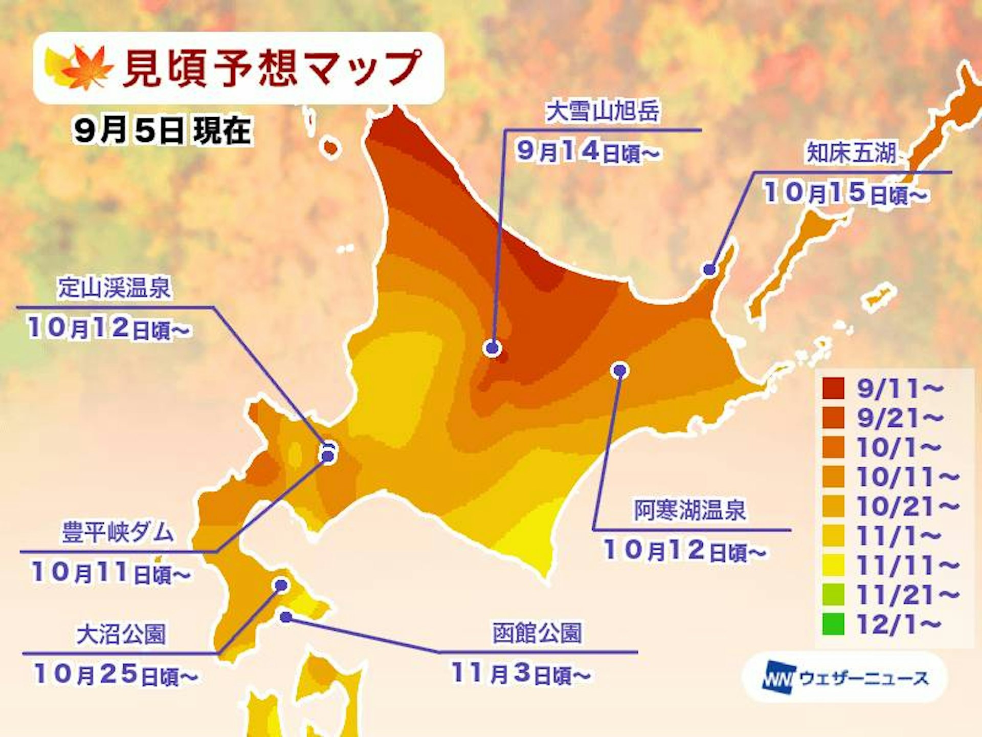 日本北海道地區往年紅葉預測(圖片來源:weather.jp)