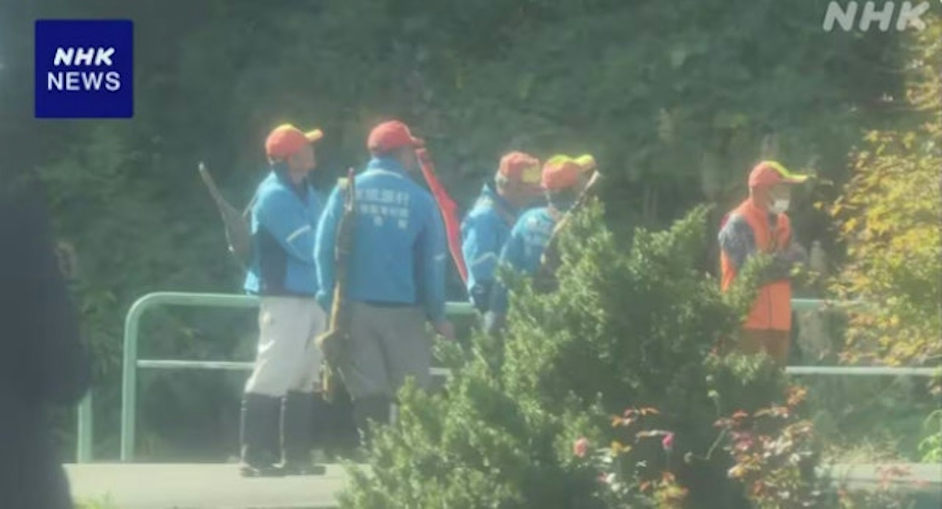 2025年10月24日,日本秋田縣東成瀨村發生熊隻襲擊人類事件後,當地警方及獵人組織到場調查。(NHK 截圖)