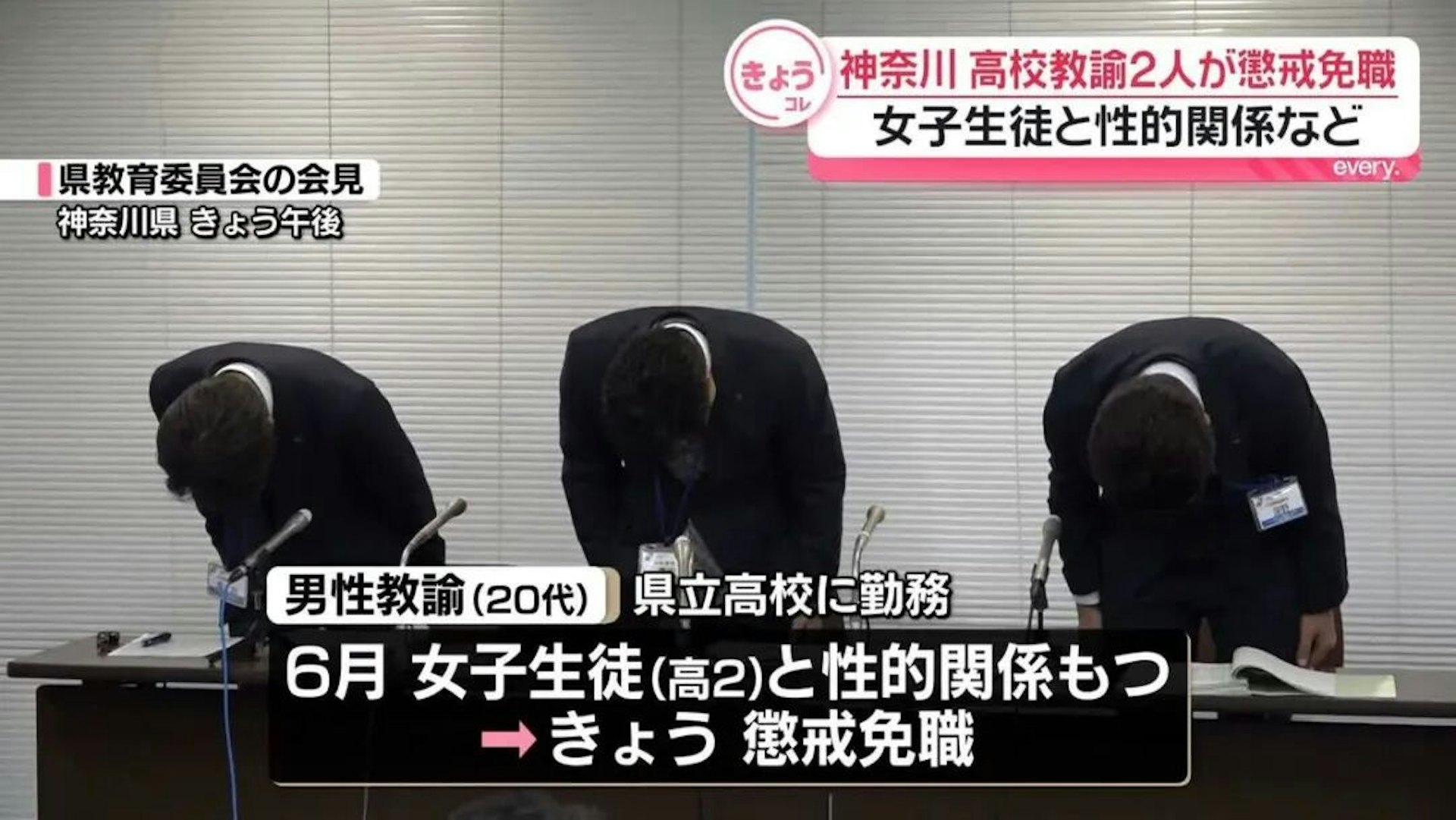 第一件事,發生在橫濱的一所縣立高中。一名20多歲的男老師,今年6月居然和自己學校的一名高二女生發生了性關係。 事情曝光後,警方立刻介入,逮捕、起訴,法院最後下了個罰金50萬日元(約合2.5萬港元)的略式命令。與此同時,縣教育委員會在9月4日也做出了最重的處分——懲戒免職。對日本老師來說,這幾乎等於徹底告別教職生涯,往後找工作也會有案底跟著。