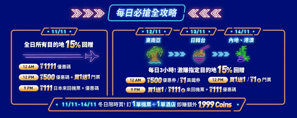 凌晨 00:00 狂搶: 預訂機票或酒店滿 $2,000,即刻減 $1,111!😱 呢個折扣率勁到癲! 中午 12:00 加碼(只限 11 月 11 日): 酒店訂單滿 $1,000,即刻減 $500!如果淨係想訂酒店,記住要搶呢個! 其他日子: 11 月 12、13、14 號嘅凌晨同中午,都會派發不同面額嘅優惠碼,例如滿 $1,000 減 $500,總之就係日日有嘢搶! ✨ $1 蚊秒殺!當地體驗門票/SIM 卡抵到笑! 想去玩當地景點、買數據卡?記得鎖定埋呢個優惠!