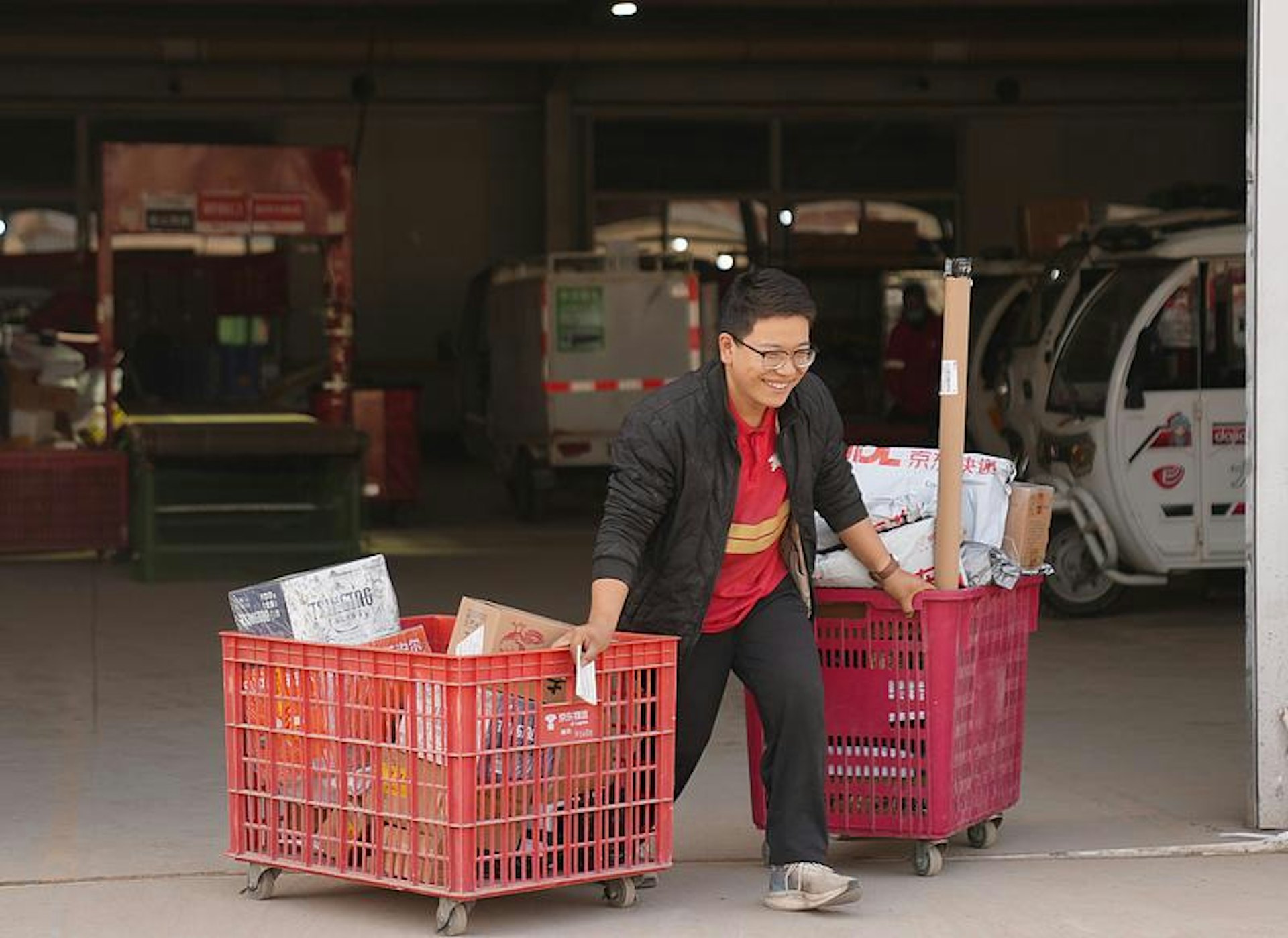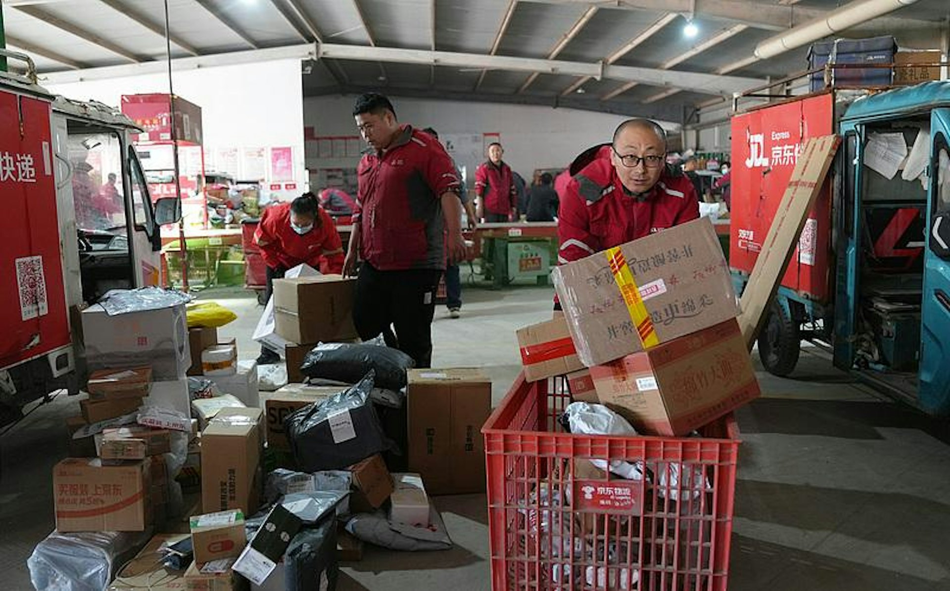 2025年11月11日,山東濱州,京東快遞秦皇河營業部工作人員搬運快遞包裹。(CFP)